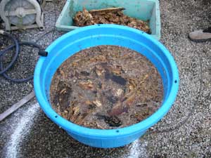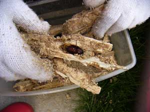 2004/5/13 朽木にアリの巣があった為取り除くことに、水攻めにしてアリを追い出すことにした。 (ところが数日後木を割ってみると、しぶとく生きながらえていた。 |